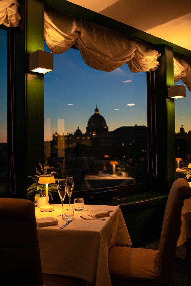 L'ambiente è un rifugio romantico e senza tempo immerso nel verde mediterraneo, con profumi di menta, rosmarino, mirto, alloro e erica che arricchiscono l'atmosfera. Gestito dalla famiglia Menucci, al secondo piano di generazione, il ristorante al sesto piano presenta una cucina a vista guidata dallo Chef William Anzidei. Il menu evidenzia piatti di pesce e carne ispirati alla tradizione romana, enfatizzando la stagionalità, la qualità degli ingredienti e la texture, con il forno a carbone Josper come elemento distintivo. Sono disponibili opzioni senza glutine, vegetariane, vegane e per celiaci.
